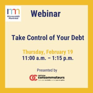 Debt Solutions – Webinar Presented by Option Consommateurs February 19 From 11:00 a.m. to 1:15 p.m. Building healthy financial habits starts with the right tools. This webinar will help you better understand debt-related challenges and explore practical solutions to improve your financial situation. Topics include: • How to get out...