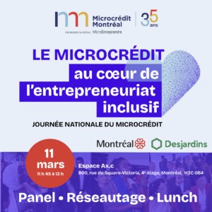 À l’occasion de la Journée nationale du microcrédit, nous vous invitons à un moment d’échange sur le thème : Le microcrédit au cœur de l’entrepreneuriat inclusif. 11 mars | 11 h 45 à 13 h. Au programme : Panel • Réseautage • Lunch Espace Ax.c 800, rue du Square-Victoria, 4e étage,...