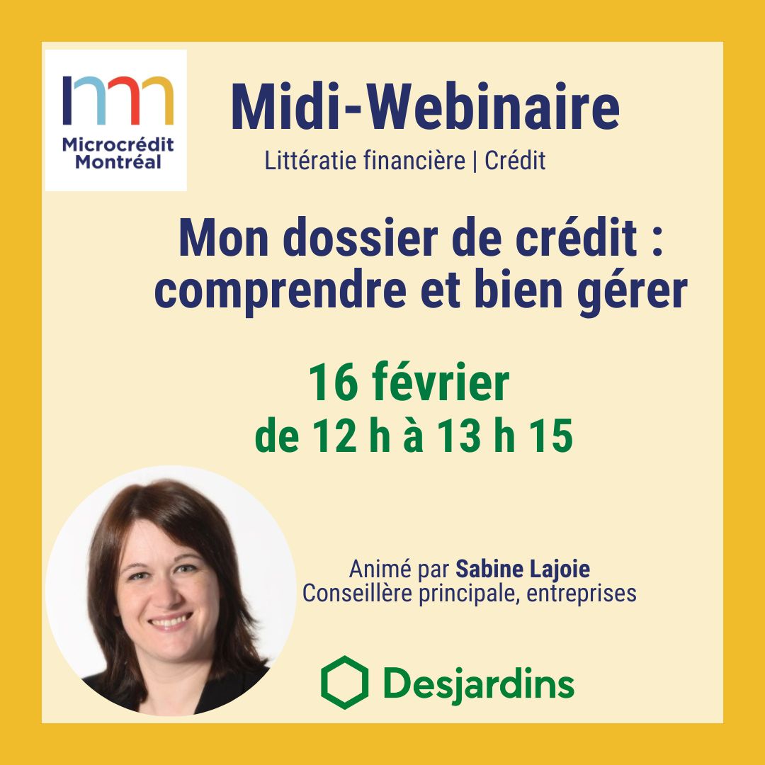 Midi-webinaire – Littératie financière Lundi 16 février 2026 De 12 h à 13 h 15 Le crédit joue un rôle clé dans votre vie financière, autant personnelle qu’entrepreneuriale. Savoir l’utiliser adéquatement permet de faire de meilleurs choix, d’éviter des erreurs coûteuses et de réduire le stress lié aux finances. Ce webinaire vous permettra de mieux […]