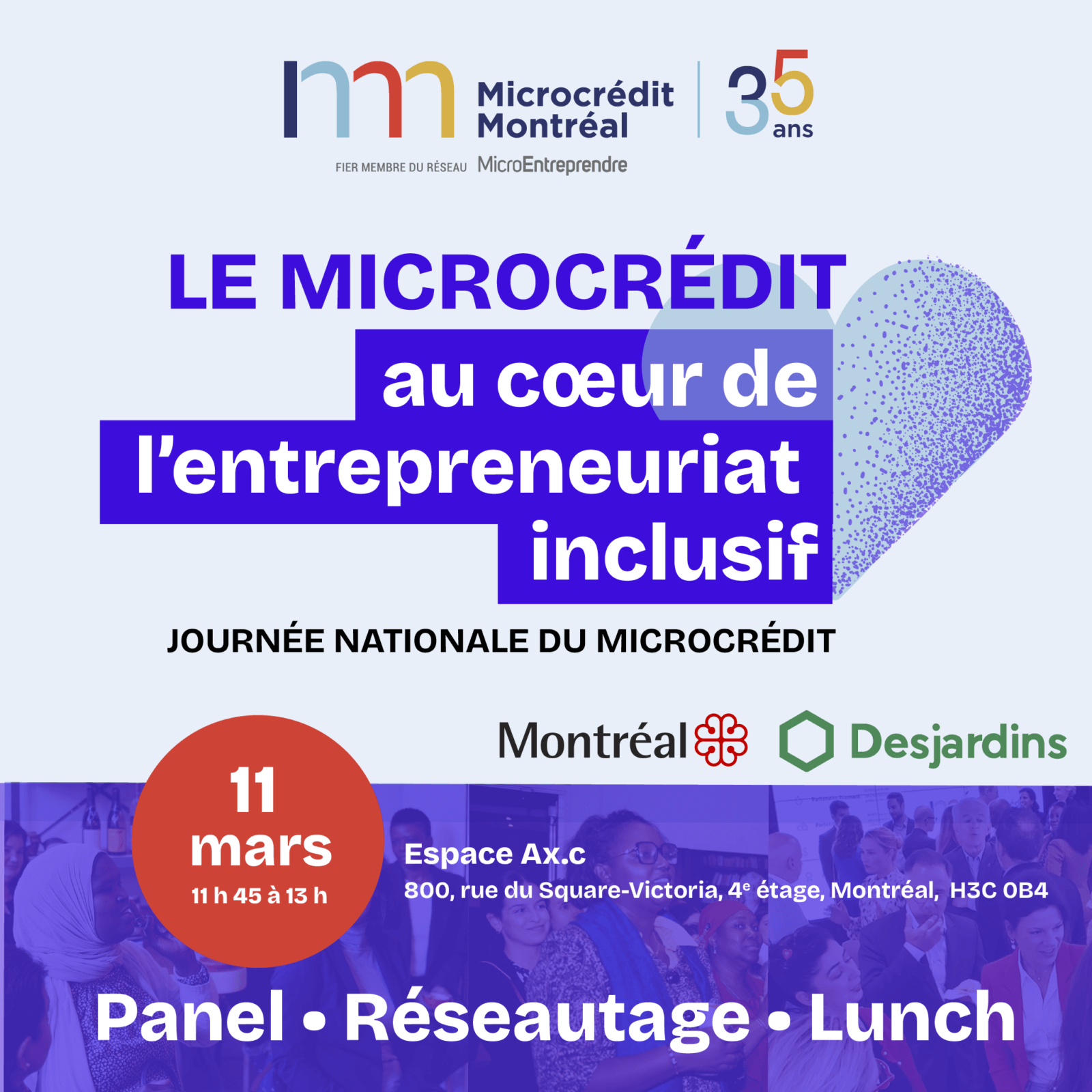 À l’occasion de la Journée nationale du microcrédit, nous vous invitons à un moment d’échange sur le thème : Le microcrédit au cœur de l’entrepreneuriat inclusif. 11 mars | 11 h 45 à 13 h. Au programme : Panel • Réseautage • Lunch Espace Ax.c 800, rue du Square-Victoria, 4e étage, Montréal (QC) H3C 0B4. Cet […]